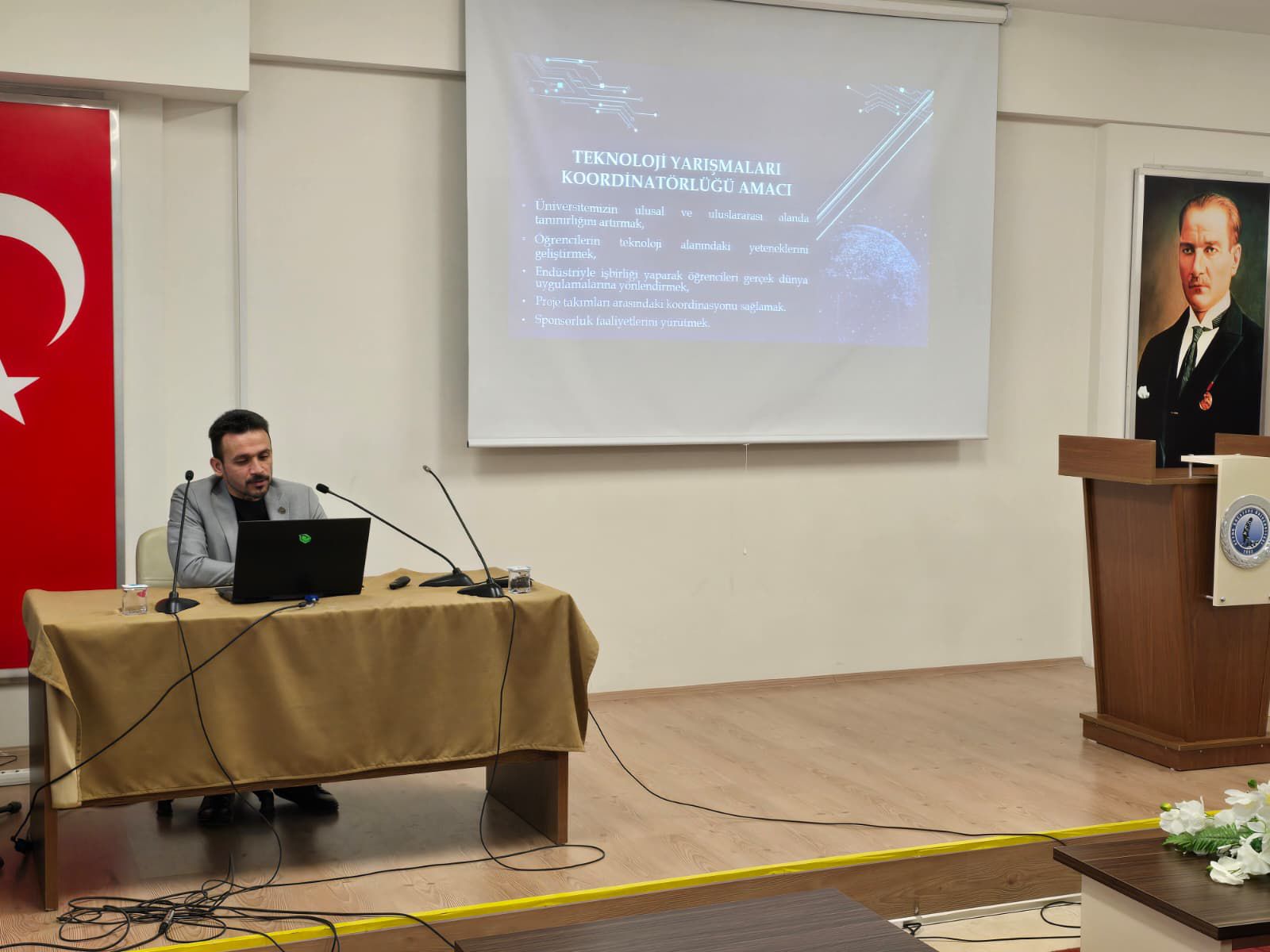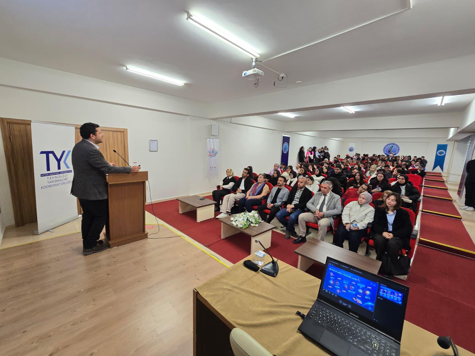 Doç. Dr. Mustafa YALÇIN (AKÜ Bilimsel Araştırma Projeleri/BAP Koordinatörü): Doç. Dr. Yalçın, öğrencileri projelerini hayata geçirirken ihtiyaç duyacakları mali ve bilimsel kaynaklar konusunda bilgilendirdi. BAP biriminin, TEKNOFEST projelerine sağladığı finansal destekleri ve proje başvuru süreçlerini anlatarak, öğrencileri yenilikçi fikirlerini desteklemek üzere davet etti.