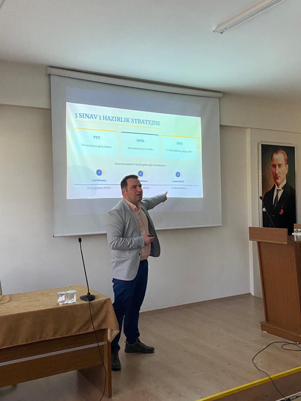 “Yüksekokulda uygulanan kariyer odaklı eğitim anlayışı ön plana çıkıyor. Bu çerçevede en dikkat çekici başlıklardan biri, “3+1 İşletmede Mesleki Eğitim Modeli” dir.  Model kapsamında öğrenciler üç dönem teorik eğitimi okulda almakta, bir dönem ise doğrudan işletmelerde uygulamalı eğitim görerek sektör deneyimi kazanmaktadır. Bu sistem sayesinde sizler mezuniyet öncesinde iş hayatına uyum sağladıkları ve istihdam süreçlerinde avantaj elde etme fırsatı buluyorsunuz. Ayrıca aranızda kamu sektöründe kariyer hedefleyenleriniz olabilir. Bunu hedefleyenler KPSS ile devlet kadrolarında istihdam imkânı bulabilirken, özel sektörde ise 3+1 modeli sayesinde erken dönemde iş bağlantıları kurma ve hızlı istihdam fırsatlarını yakalayabilirler. Akademik ilerleme hedefleyen öğrenciler için ise DGS ile lisans programlarına geçiş imkânı sağlayabilirler. Yüksekokulumuzun eğitim yaklaşımında öne çıkan bir diğer önemli unsur ise “3 Sınav, 1 Hazırlık Stratejisidir. Bu stratejiyle öğrencilerin yalnızca mevcut eğitim süreçlerine değil, aynı zamanda gelecek kariyer hedeflerine de çok yönlü ve planlı bir şekilde hazırlanmaktadırlar. Yani TYT’ye hazırlanan bir öğrenci aslında KPSS, DGS gibi diğer sınavlarında zeminini hazırlamış oluyor.” Dedi.
